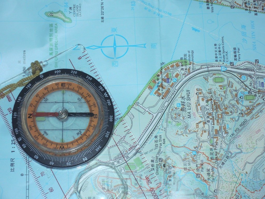 「正置」地圖,就是將地圖的北方,與指南針的北方平行放置,這時地圖的上方就是你眼前的方向了。